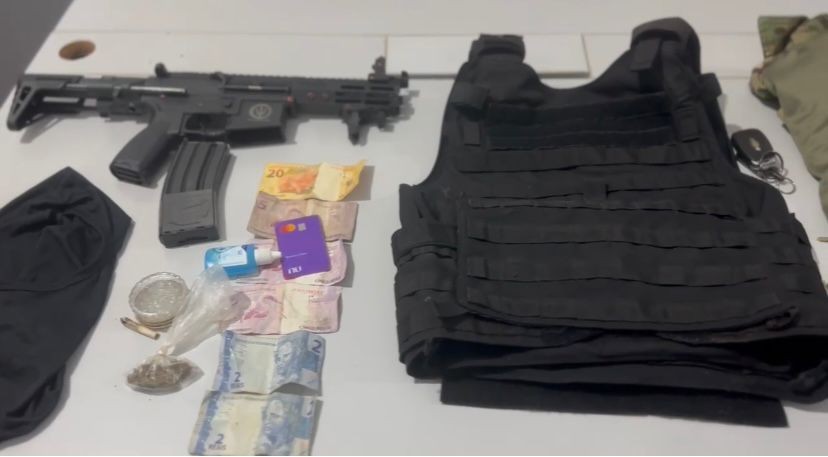 Com a dupla, a polícia apreendeu também uma pistola calibre .40 com carregador, um simulacro de arma de fogo do tipo airsoft, duas porções de maconha, um celular e o cartão de crédito da vítima do assalto.