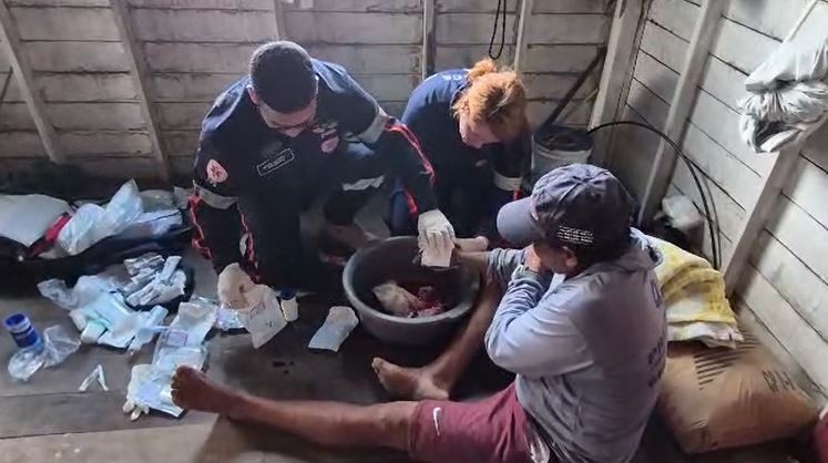Um helicóptero foi enviado com uma médica e um enfermeiro a bordo. A equipe conseguiu pousar com segurança na região isolada e prestou os primeiros socorros à vítima. Após ser estabilizado, o homem foi transportado para o HE de Macapá.