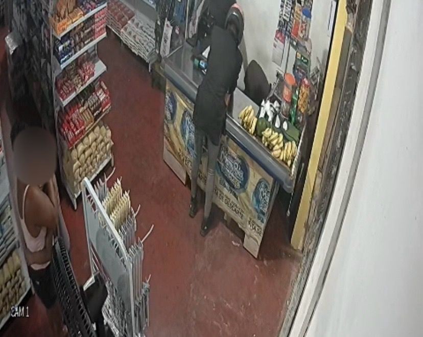 O vídeo mostra o momento em que um homem armado com uma faca entra na mercearia e rende o atendente, que estava no caixa com uma mulher e uma criança. Pouco depois, outro suspeito chega para ajudar no assalto.